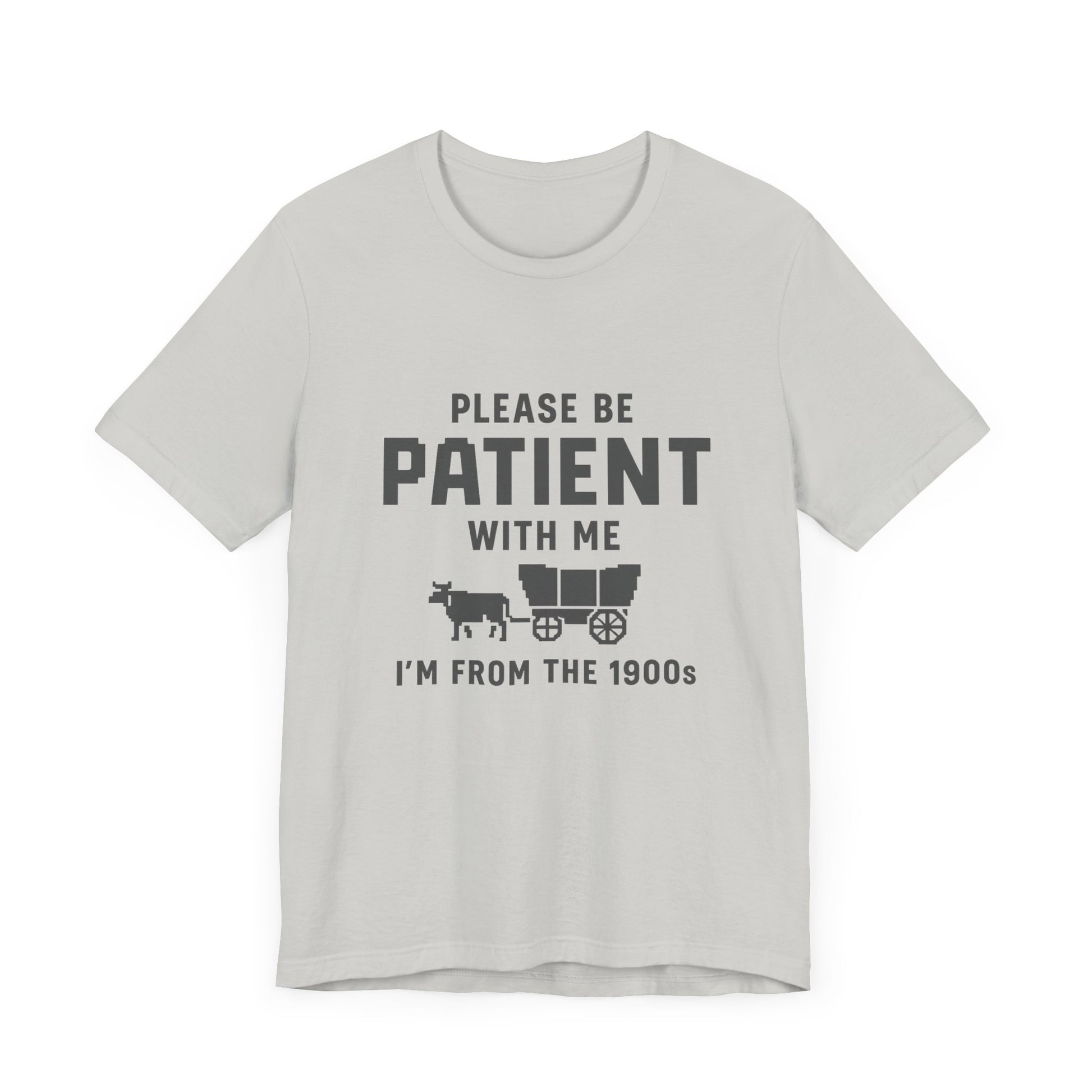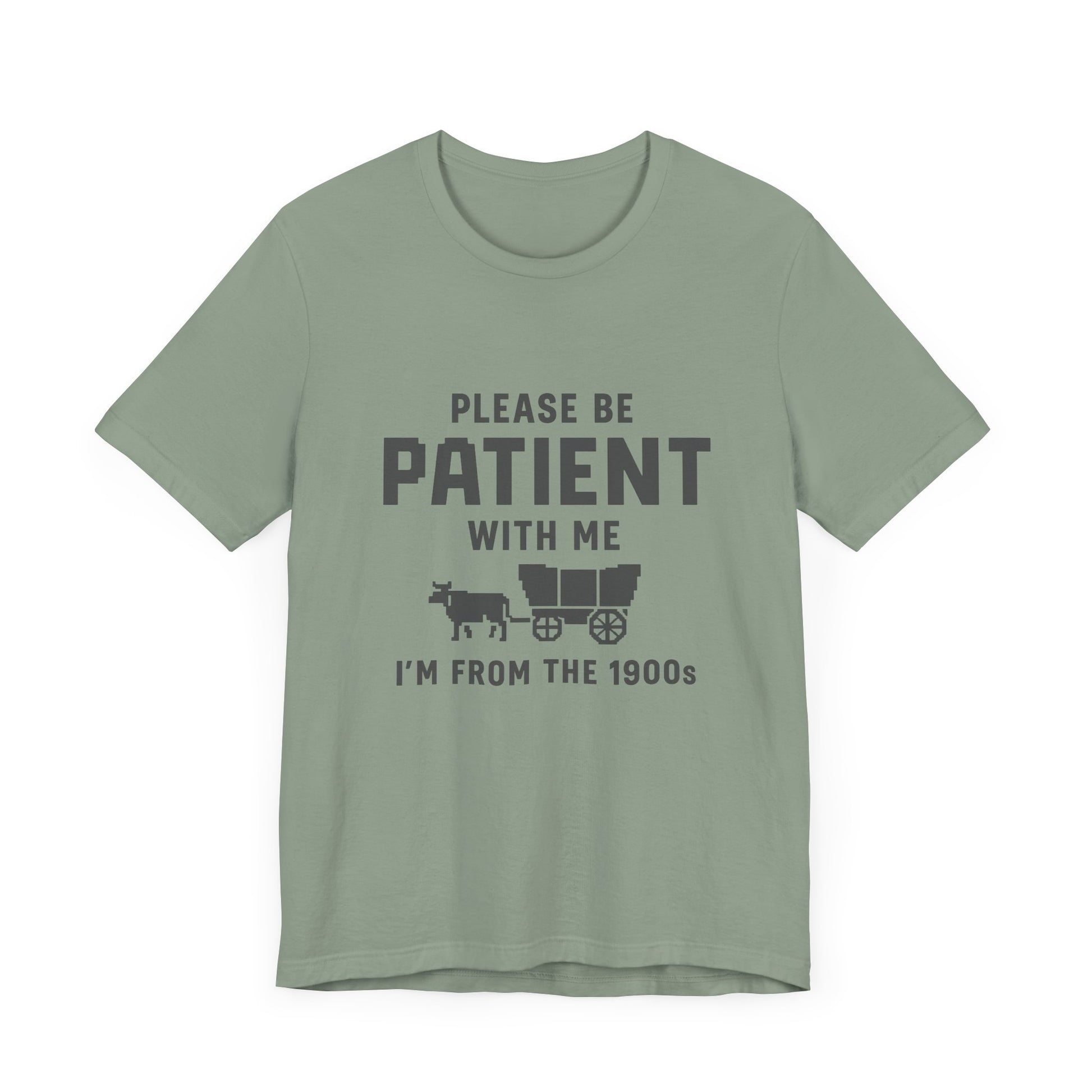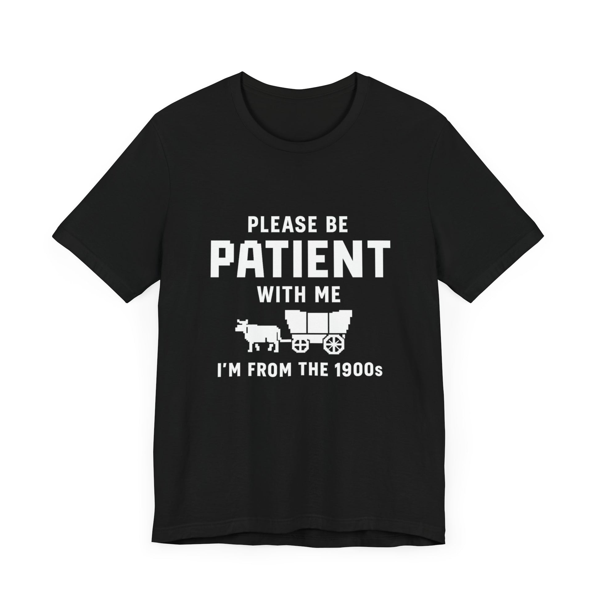 This unisex t-shirt features a retro pixelated ox wagon and bold lettering that proudly says, “Please Be Patient With Me, I’m From the 1900s.” Whether you’re tired of Gen Z slang or just embracing your analog roots, this shirt says it all – with humor and vintage flair.