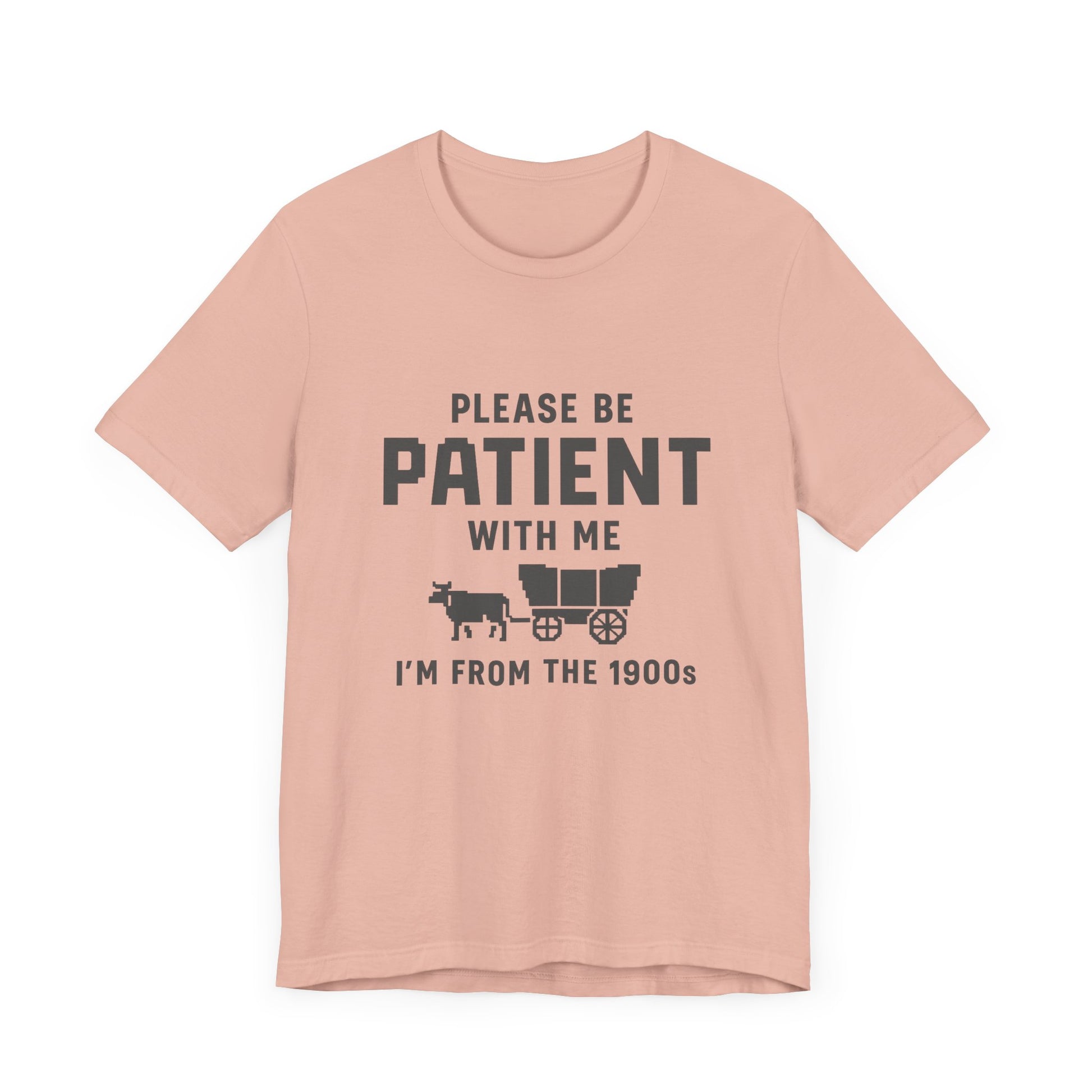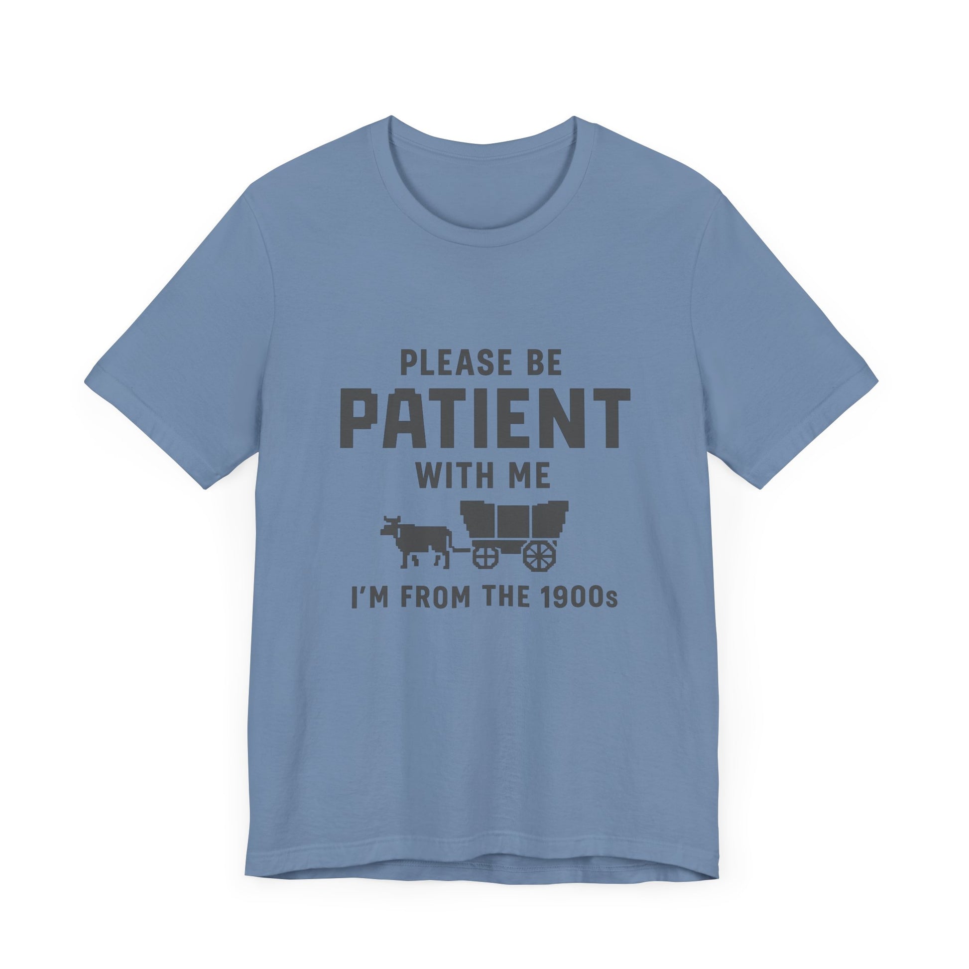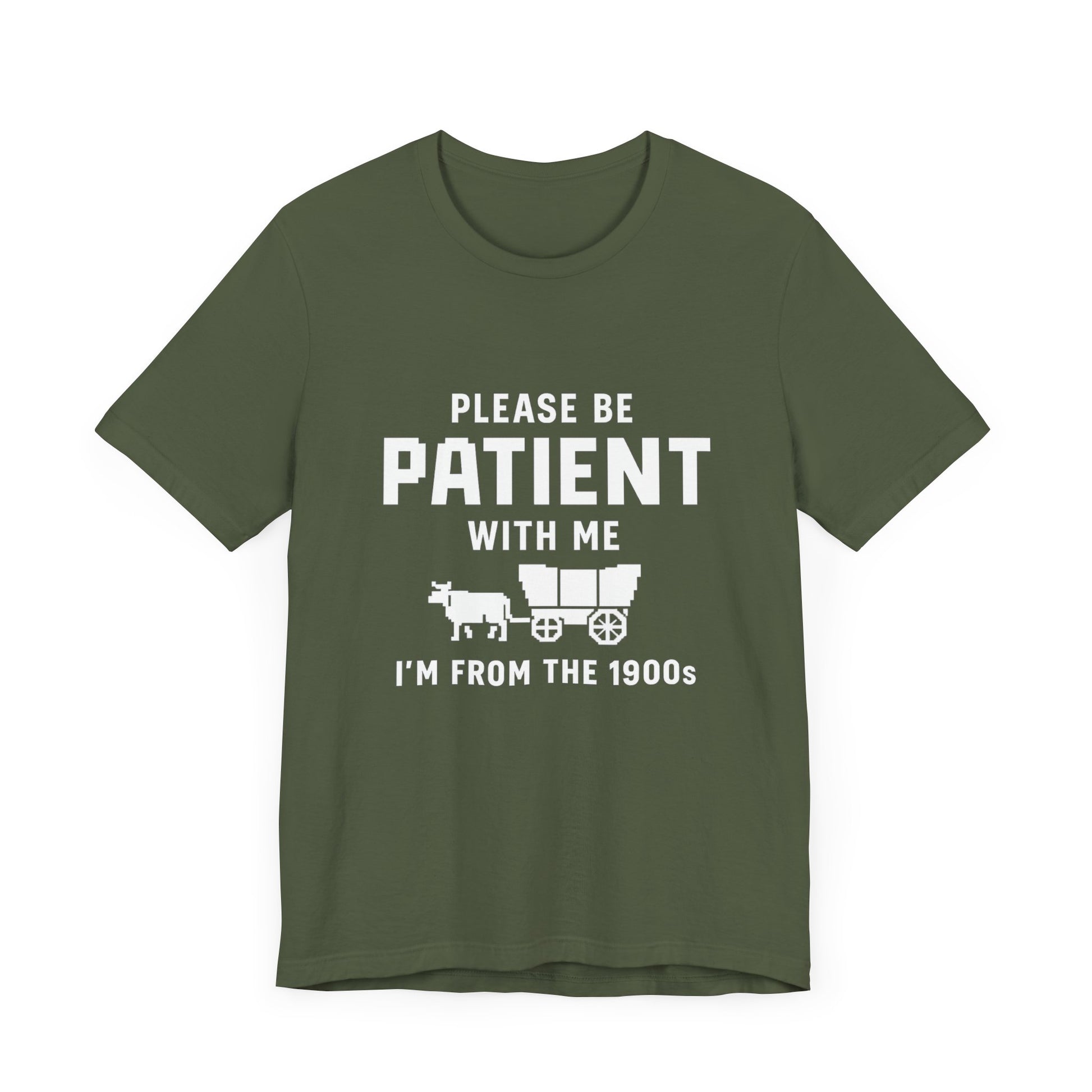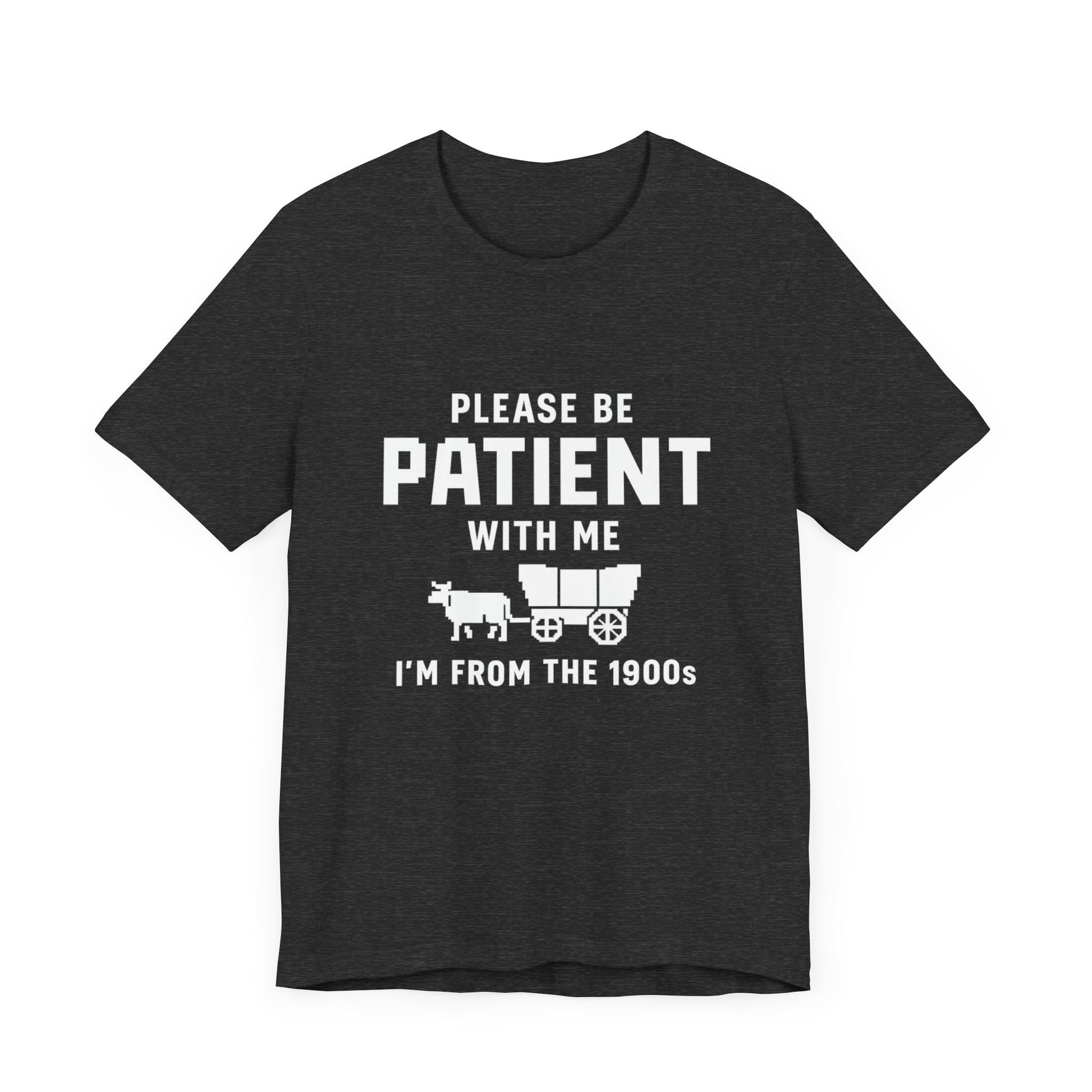 This unisex t-shirt features a retro pixelated ox wagon and bold lettering that proudly says, “Please Be Patient With Me, I’m From the 1900s.” Whether you’re tired of Gen Z slang or just embracing your analog roots, this shirt says it all – with humor and vintage flair.